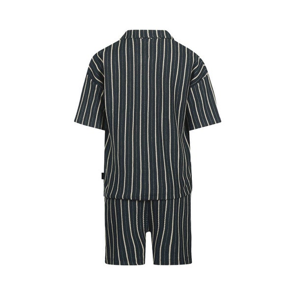 Deze Koko Noko 2-delige set voor jongens is perfect voor een trendy en comfortabele zomerlook. De set bestaat uit een loose fit shirt met een open kraag en bijpassende shorts, beide uitgevoerd in een stoere navy kleur met contrasterende verticale strepen. Gemaakt van een comfortabele mix van 80% katoen en 20% polyester, biedt de set een zachte feel en duurzaamheid voor alle avonturen. De relaxte pasvorm van zowel het donkerblauwe Koko Noko shirt met kraag als de korte broek zorgt voor optimale bewegingsvrijheid tijdens warme dagen. Een complete en stijlvolle outfit voor de jonge ontdekkingsreiziger.